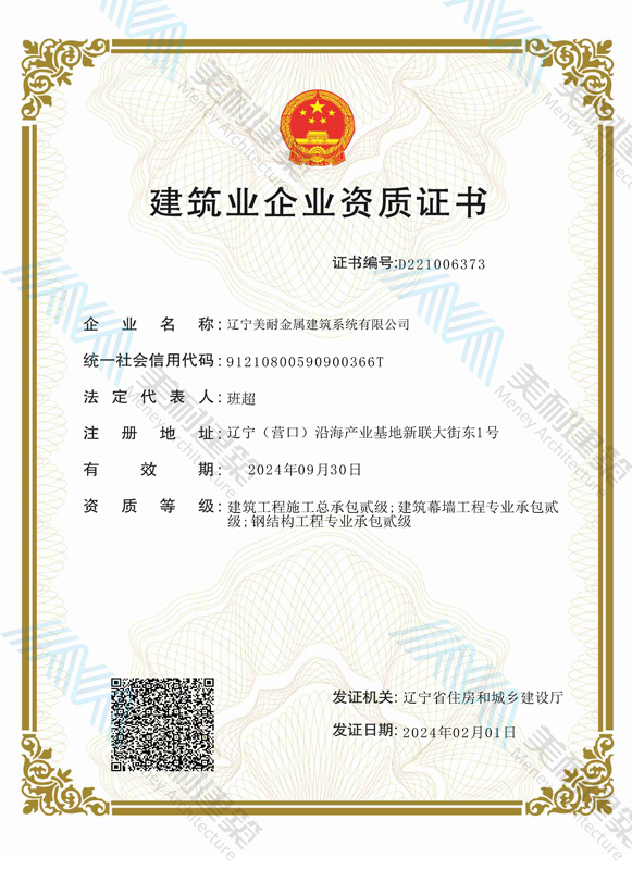 遼寧美耐金屬建筑系統(tǒng)有限公司位于遼寧(營口)沿海產業(yè)基地,專注于預制金屬建筑系統(tǒng)領域,是一家集工業(yè)建筑設計、制作、施工及相關的技術咨詢與服務為一體的綜合性服務企業(yè)。作為國家鋼結構協會會員、中國建筑金屬結構協會會員單位與國家高新技術企業(yè),美耐建筑集建筑工程施工總承包、鋼結構工程專業(yè)承包等多種資質于一身,并擁有22項鋼結構建筑領域專利,9項軟件著作權。